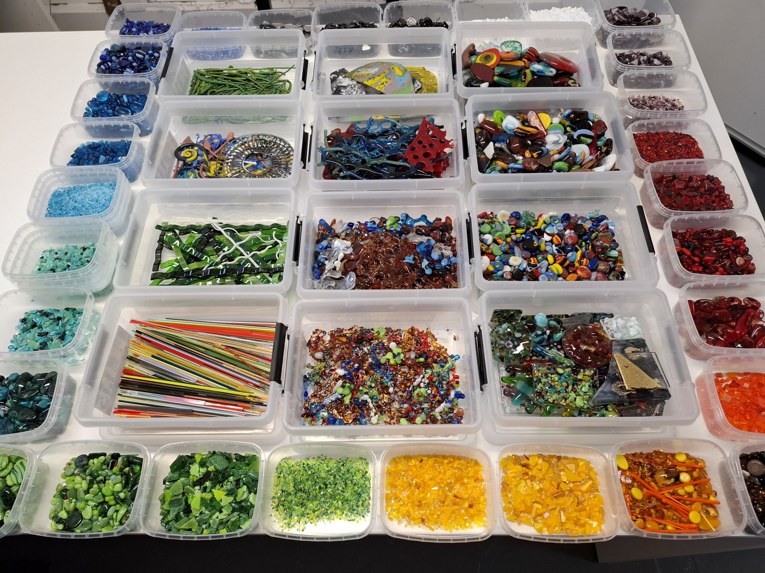 - Materiaal: kneedglas, fuse-verf, glaszand en allerhande glas decoratie’s die niet scherp zijn.