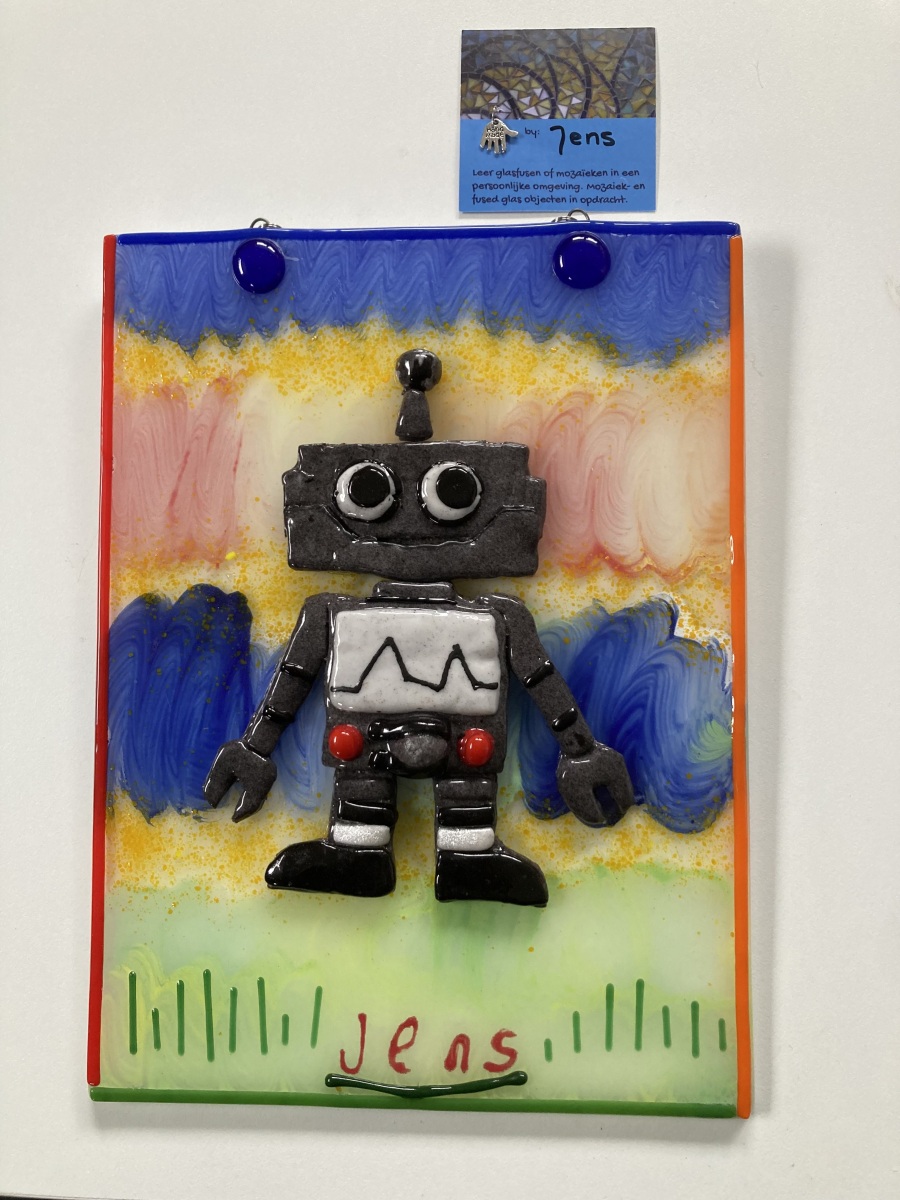 Uw kind kan zijn/haar favoriete dier, stripfiguurtje, held of heldin ook boetseren aan de hand van een plaatje en eventueel verder versieren met verf. Hiervoor is het nodig om vooraf (minimaal 10 dagen) een (eenvoudige) kleurplaat of tekening aan mij te mailen of sturen. Aan de hand hiervan kan ik een onderlaag voorbereiden die alvast gedroogd kan worden. Deze onderlaag kan het kind dan verder ‘aankleden’ m.b.v. kneedglas, glasballetjes, stukjes of staafjes glas (niet scherp), verf enz. We kiezen een achterplaatje dat eventueel ook geverfd of versierd kan worden of we fusen ringetjes mee zodat het kunstwerk opgehangen kan worden (want uiteindelijk blijft het glas, dus is het niet geschikt om mee te spelen). Wanneer het werkstuk zal worden ingelijst, is het achterplaatje niet nodig.