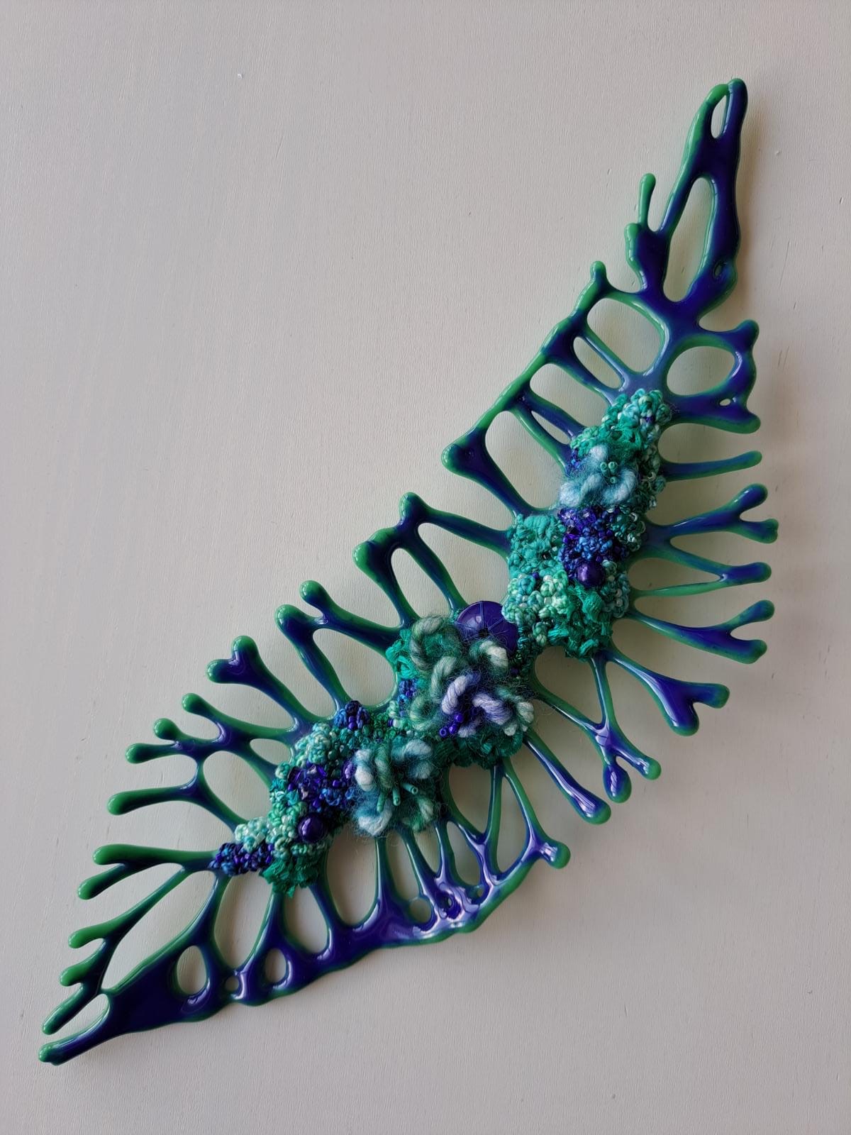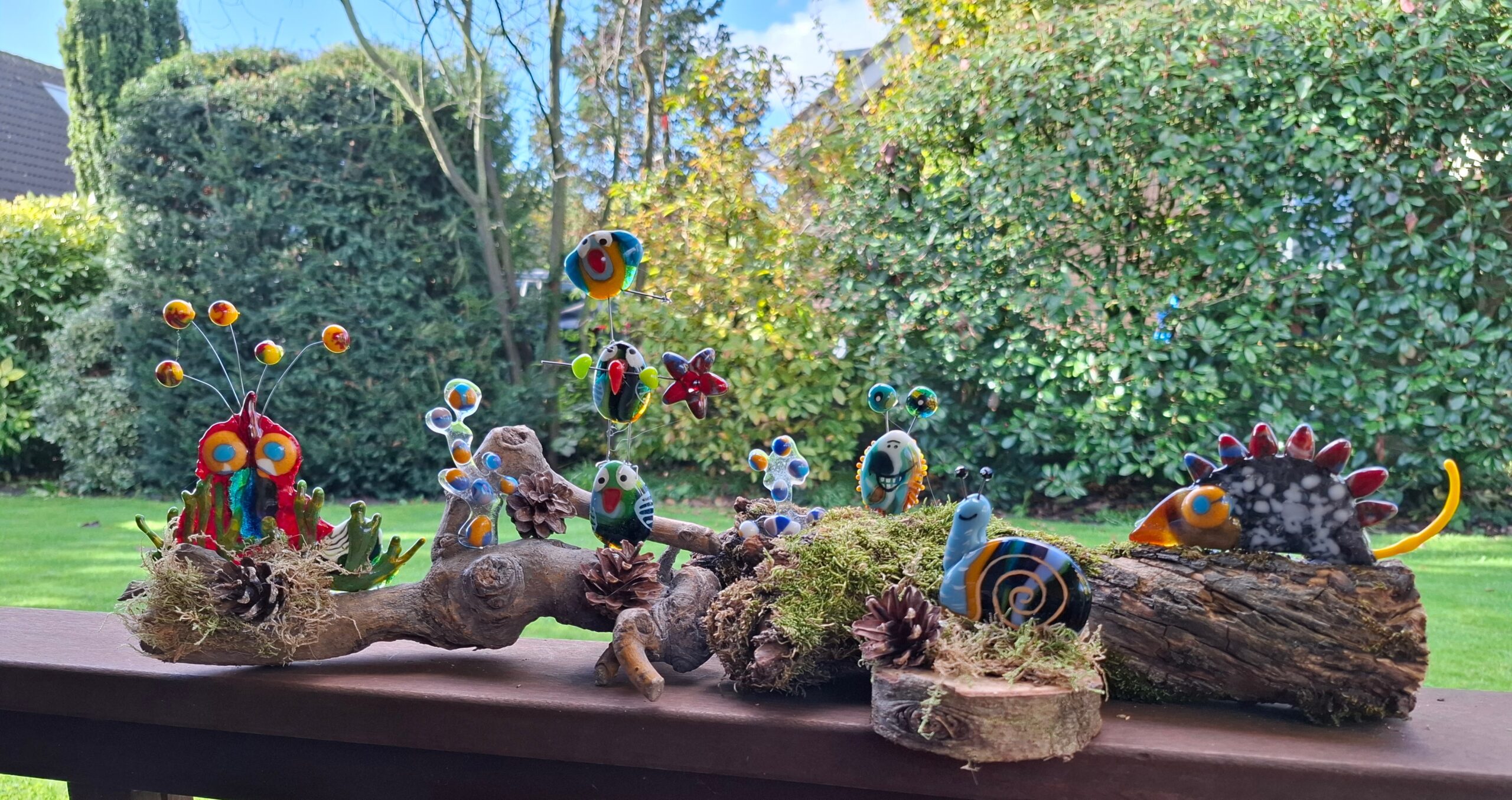 Ènnnn…. nooit uit-geëxperimenteerd! Dan blijken combinaties mogelijk, zoals met hout, verf of steen. Maar ook met heel andere disciplines zoals bijvoorbeeld borduurwerk. Samen met mijn dochter Suzanne (ook bekend als ‘de draadfanaat’) ontdekken we de mogelijkheid om haar kracht met de mijne te bundelen. Glas met draadwerk; wie had dat gedacht! Suzannes werk is eveneens te zien op haar instagram-account …